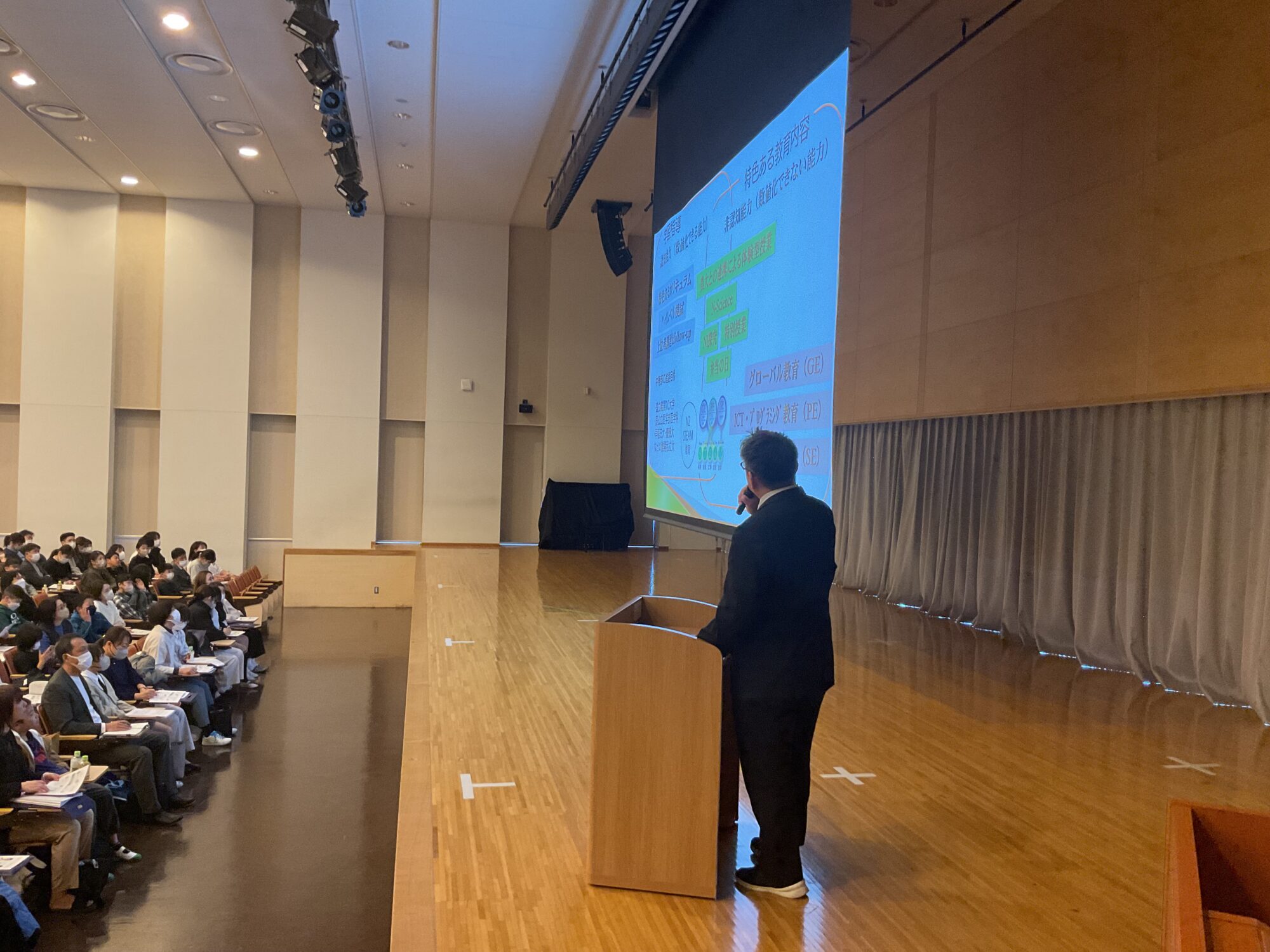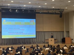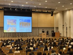 第1部では校長挨拶に続き、学校説明、入試説明を行いました。学校説明では本校の学習指導や体験的な学習(理科教育、グローバル教育、ICT教育)の様子についてお伝えした他、一期生である中等部3年生の2名の生徒に登壇していただき、学校生活や学習についてお話していただきました。また、入試説明では今年度入試結果や次年度入試概要について説明させていただきました。入試説明の際には小学生の希望者を対象に「校内探検」を実施し、本校生徒が学校内を案内しました。